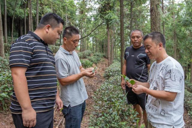縣茶葉辦的領導和專家在產園指導田熙軍(左2)林下野生綠茶生產