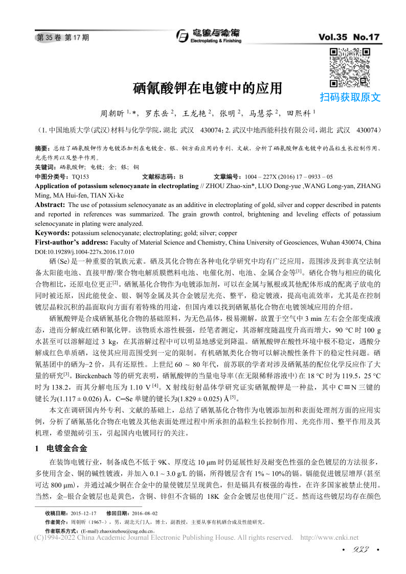 本文在調(diào)研國(guó)內(nèi)外專(zhuān).利、文獻(xiàn)的基礎(chǔ)上,總結(jié)了硒氰基化合物作為電鍍添加劑和表面處理劑方面的應(yīng)用實(shí)例,分析了硒氰基化合物在電鍍及其他表面處理過(guò)程中所承擔(dān)的晶粒生長(zhǎng)控制作用、光亮作用、整平作用及其機(jī)理,希望拋磚引玉,引起國(guó)內(nèi)電鍍同行的關(guān)注。